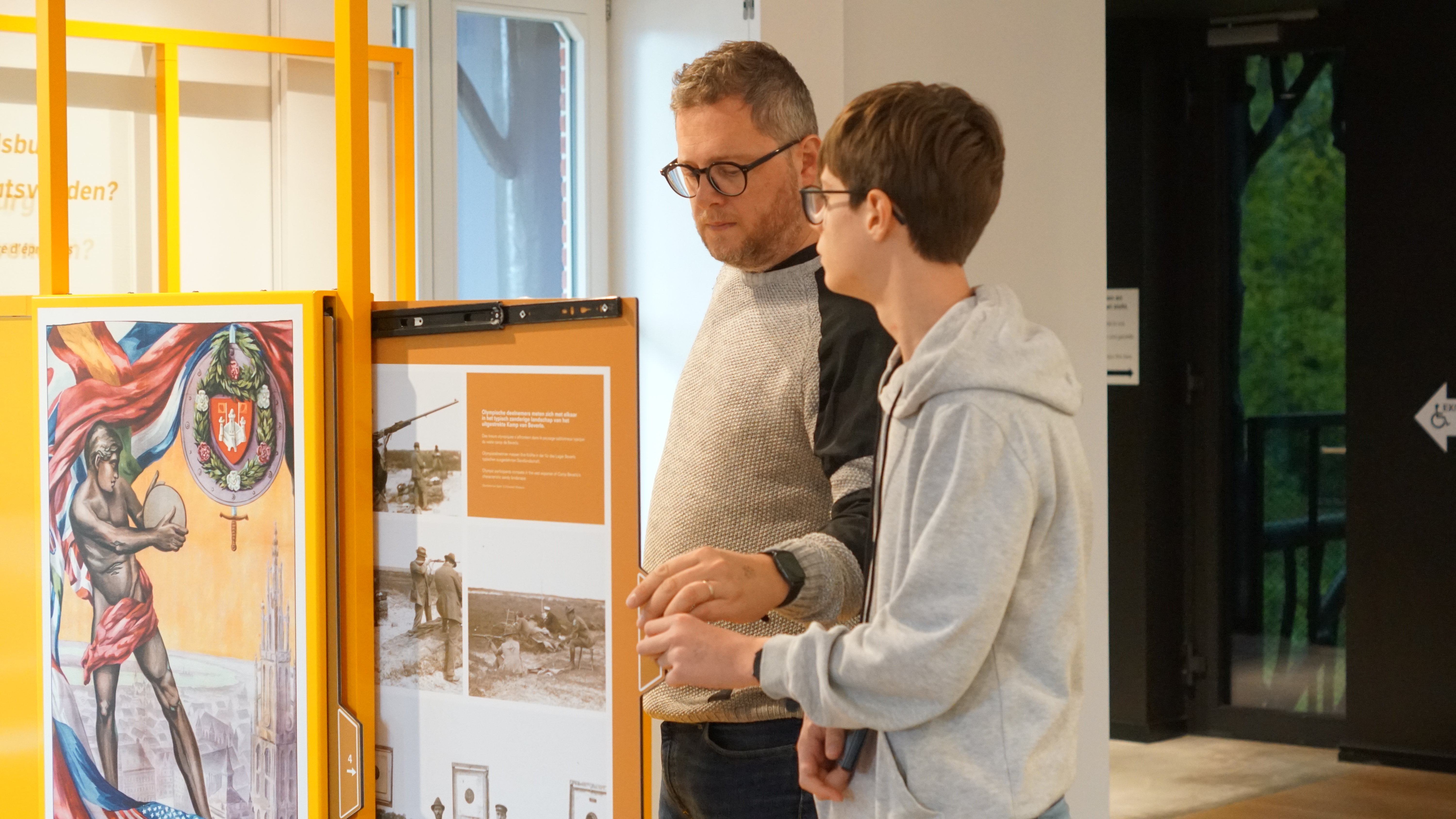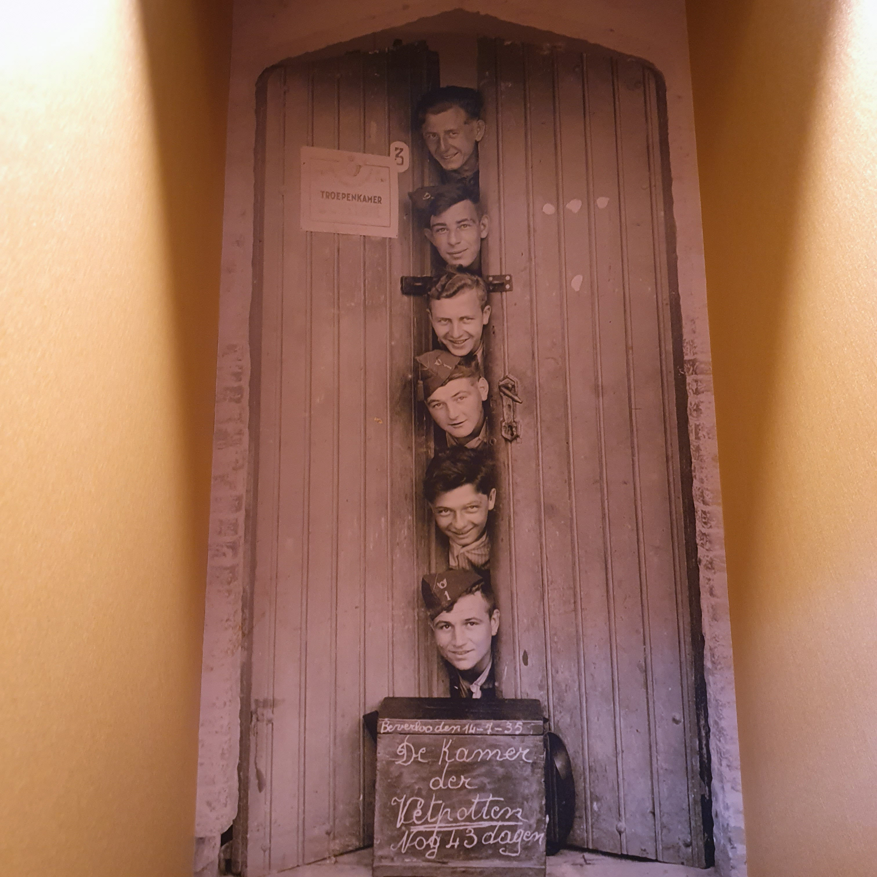 Na een warm welkom staken we onze spullen in de mooiste gouden lockerroom die we ooit hebben gezien. We kregen meteen ook een audiogids om onze nek. Tijdens het bezoek voorzag deze audiogids ons van achtergrondverhalen. Na een kort introductiefilmpje over de site zelf werden we meteen teruggebracht naar de Tweede Wereldoorlog. Het museum belicht de rol van Leopoldsburg in deze oorlog. In plaats van een algemeen overzicht of een verhaal dat ver van ons af staat, worden de geschiedenis enkele getuigen verteld: een verzetsstrijder, een kind, een bevrijder of een Duitse bezetter. Zij namen ons steeds weer mee en vertelden hoe zij destijds de gebeurtenissen beleefden. Beide zijden hebben, zoals altijd, hun eigen waarheid.